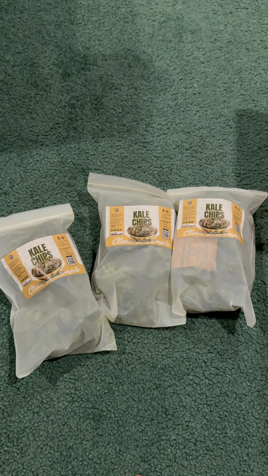 Includes three quart size bags of kale chips packed with biodegradable packaging and shipping materials.